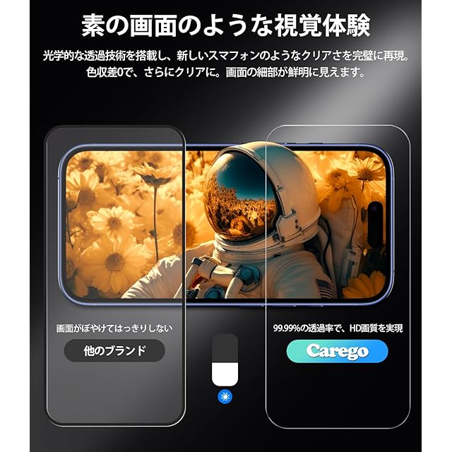 【業界初!iPhone 16用強化ガラスフィルム・簡単貼付、100%成功率】フィルムのズレ、気泡、ホコリにもう悩む必要はありません!Caregoは、フィルム貼り付けをより簡単にする新しいホコリ除去ガイド枠付き強化フィルムを発売しました。画期的な自動位置合わせ&静電除塵技術により、引き出すだけで気泡ゼロ、ズレやホコリの心配もなく、簡単にフィルムを装着できます。たった2ステップで初心者でも100%完璧に貼り付け、美しい視界を手に入れましょう!