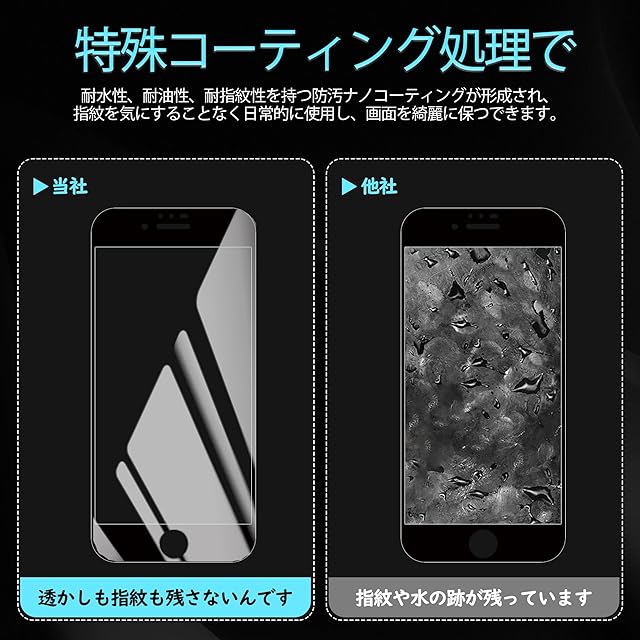 【指紋防止、高感度タッチ】iphone se2 ガラスフィルムには撥油コーティングが施されており、指紋や汚れなどに強くなめらかな操作感を実現、付着した汚れなどは簡単に拭きとれます。こちらは高耐久撥油コーティングが施され、つるつるな滑り感を実現!ゲームしても渋くなし!