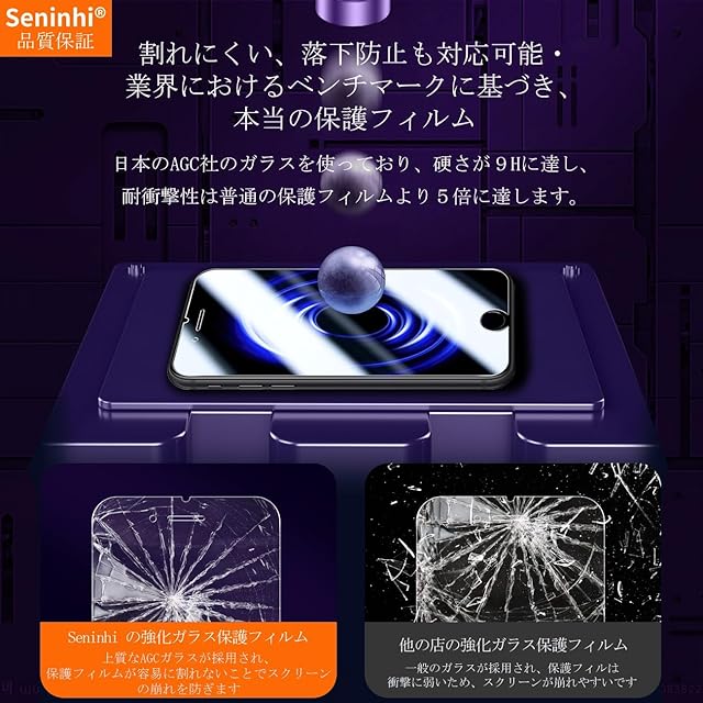 ☞【国産AGC旭硝子ガラス 素材】携帯フィルムは国産AGC旭硝子ガラスを使っており、4.5時間の高温焼入れ処理して、強化を繰り返し、硬さは業界トップレベルの9Hに達しました。市販の通常製品の5倍の硬さに達し、ナイフなどの鋭いものでも傷しません。ハードコーティング技術を利用して、外部衝撃を吸収し、防爆性をアップして、外からの衝撃に簡単に吸収して、衝突されても、画面が壊れるリスクを 99% 減らします。更に iphone SE3 / iPhone SE2 / iPhone8 / iPhone7 専用の強化ガラスフィルムは飛散防止加工を行っておりますので、万が一ガラスが割れても怪我を与えません。