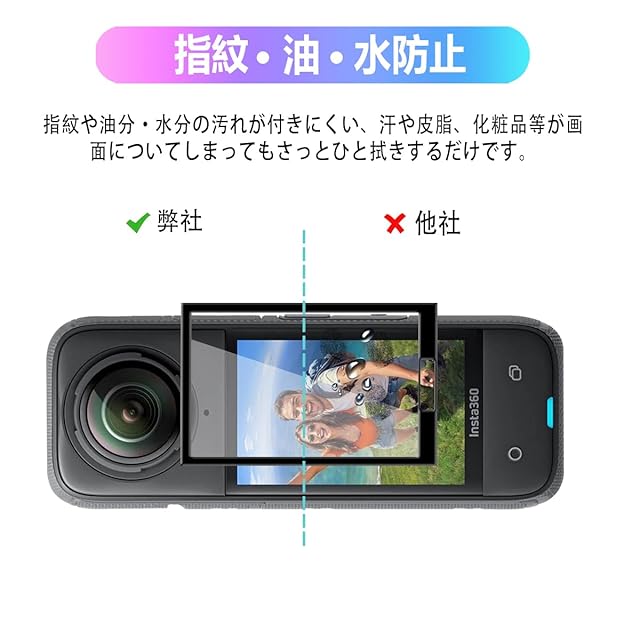 【指紋、油、水防止】カメラフィルムの表面特殊な疎油処理されているため、画面感度に影響しなくて、簡単にタッチすることができ、指触りが抜群です。指紋や油分·水分の汚れが付きにくい、汗や皮脂、化粧品等が画面についてしまってもさっとひと拭きするだけです。