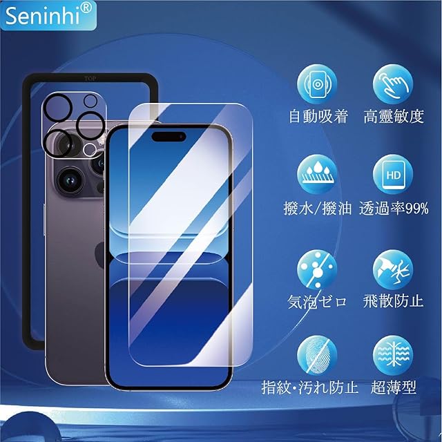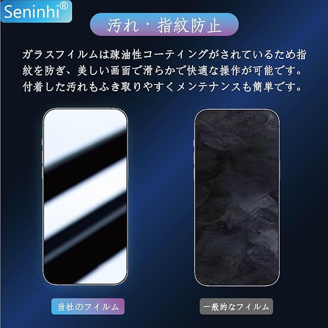 【貼り付けやすい・油防止・指紋防止】seninhiフィルムの自動吸着機能を使って初心者さえも簡単に貼り付けることができます。更に気泡も入りにくいです。フィルムを貼る前に、ホコリ取りシールで細かいホコリを取り除き、気泡の防止をお勧めします。更に私たちの強化ガラスフィルム表面にナノポリマーコーティングを設計しており、これにより油防止、指紋防止できます。汚れや油などが付いでも、簡単に軽くだけできれいになります。