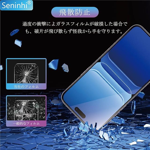 【業界最高硬さ9H&飛散防止】seninhi強化フィルムは、業界最高硬さ9Hの国産旭硝子を使用しており、それが通常の強化フィルムの5倍の耐衝撃性に達して、外から力による携帯電話の画面のきずを効果的に防止し、エッジ部分を2重に補強し、防爆性能も高いです。更に飛散防止設計により、ガラスが割れた際の飛散を防止し、高い安全性を実現します。