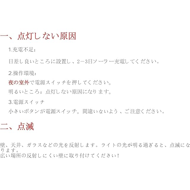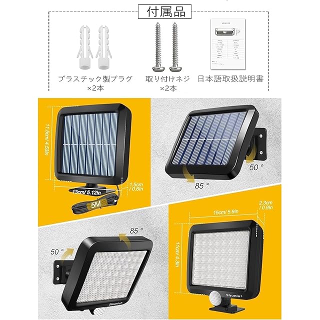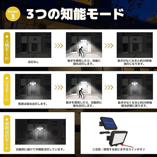 ☀保護レベルIP65:ソーラーライトは良質なABSで作られていて、耐熱性を付ける。 プロのIP65保護レベルにより、ソーラーライトの内部は防水と防塵を付ける、屋外に長時間さらされた場合でも非常に明るい光度が維持できます。