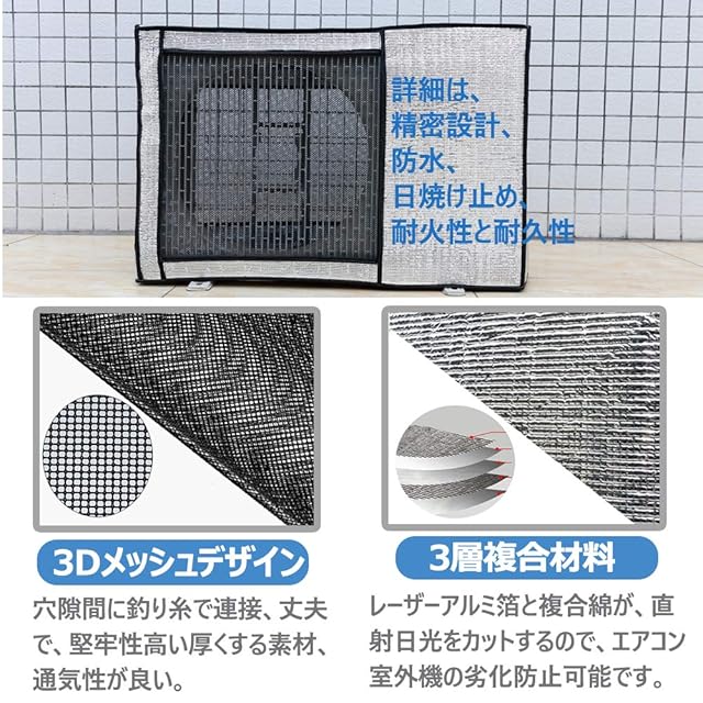 【悪天気対策】撥水加工されたエアコン室外機遮熱カバーは、直射日光、雨 、雪などの過酷な環境から室外機を守ってくれ。雨天でも快適に過ごせます。耐候性に優れているの で、オールシーズン利用できます。台風や、梅雨などの雨の季節には飛散した泥水や葉やゴミが室外 機中に入り込むのも防ぎます。目詰まりを起こしにくいし、お掃除もしやすくなります。(ご注意事 項:室外機側面などの「通風孔」をふさがずにご利用ください。)