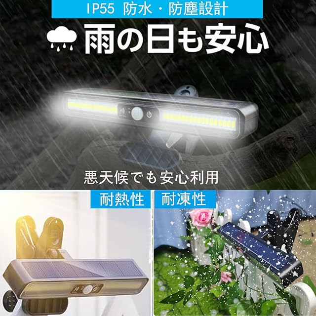 【防水防塵】屋外センサーソーラーライトはIP55相当という高い防塵防水性能を実現する雨やホコリにも強い安心の防水設計はいろいろな場所に照らせます。耐久性のあるABS材質を採用しているので、耐熱・耐凍性が優れています。悪天候てもご心配になりません。