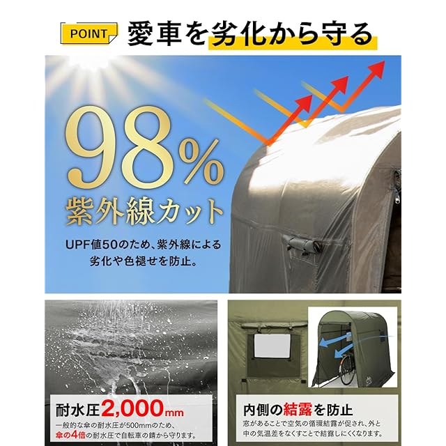 【大切なバイクや自転車を守るリーズナブルなシェルター】 PYKES PEAK( パイクスピーク )より、あなたの大切なバイクや自転車を雨風、日差し、埃から守り、快適な収納を実現します。幕の生地には、高機能ポリエステル生地を採用しています。 本体生地には、キャンプテントなどにも使用される抜群の撥水性と耐久性を兼ね備えた高機能ポリエステル生地を採用しています。シート裏面にPUコーティング加工された高耐水加工生地は、最大2,000mmの耐水圧を誇ります。シートの縫い目部にはシームテープ加工を施し、雨や水滴の侵入を軽減します。さらに、UV加工が施された生地は、UPF値50の高いUV防止効果を発揮し、大切な愛車を雨や湿気、太陽光からの紫外線などから保護し、愛車の劣化や色あせを最小限に抑えます。