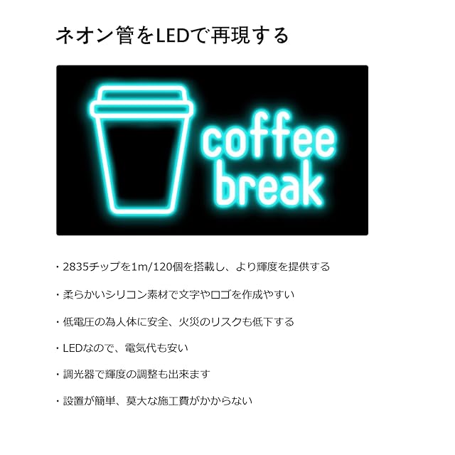 【設置簡単】柔らかいシリコン素材で複雑な文字やサインをDIY可能、LEDなので、従来のネオン管より長持ちで電気代もやすい、アダプター式で素人でも簡単に設置出来テープライトです。