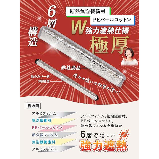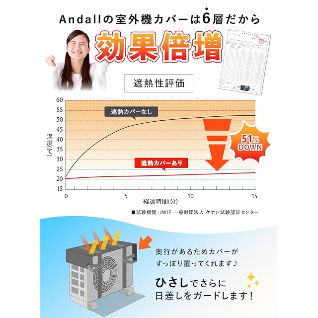 ✅✅【極厚6構造で室外機をガード】Andallの室外機カバーは新規格極厚6層構造で通常の3層構造のものと比べ約倍の厚みがあり、より優れた遮熱効果でご家庭の室外機をしっかりガード致します!Andallの室外機カバーは表面のアルミ素材に加え、2層に分かれた真空遮熱構造の気泡緩衝材と、さらにその間に別の遮熱構造を有する内気泡型遮熱材などを挿入した遮熱6層構造でより強力な遮熱効果を得ることができます!