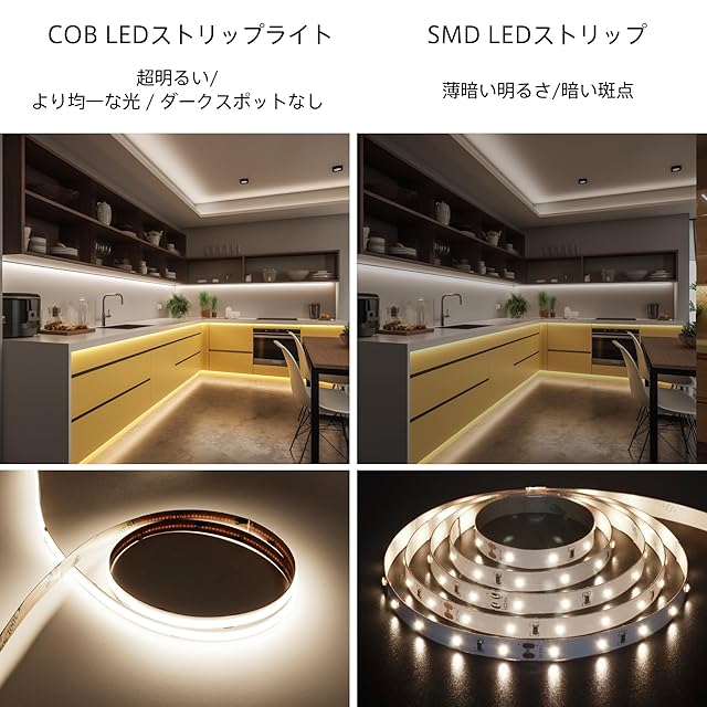 【ダークスポットなし】Cob LEDストリップライト4000Kは、ダークスポットもグレアもなく、柔らかい光で、水銀や紫外線も一切出さないので、目に安全です。4000KのLED cobテープライトは、完全に滑らかで均一な光を作り出し、シームレスな直線光のように理想的です。2400個のLED(480個/m)の高密度設計により、中央部分に暗い箇所ができるのを避けることができます。
