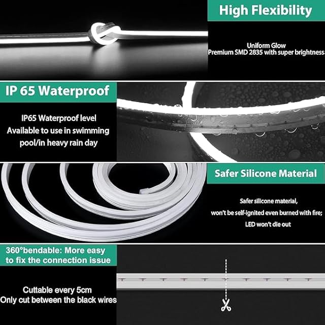 防水性と耐久性— P65防水等級のLEDテープで、プールや雨の日でも安心して使用可能。耐熱性のあるシリコン素材を使用しており、LEDも長寿命で劣化しにくい設計です。