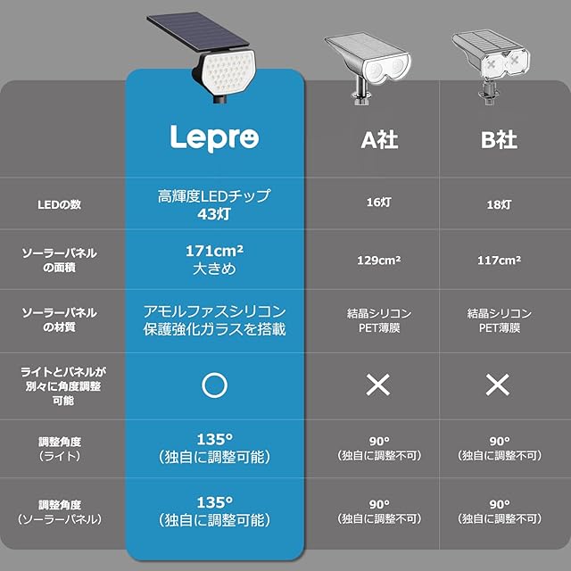 【IP65防水・屋外対応】強風による粉塵が内部に入らず、豪雨でも浸水の恐れがないIP65防水防塵仕様のため、風雨の強い天気でも使用可能。玄関・庭・通路や家の周りなど屋根のない場所でも使えてとても便利です。さらに、低温環境においても利用できるソーラー充電式電池が内蔵され、曇りや雨の日でも日中に充電可能で、冬でも安心してご利用いただけます(※雨に対応できますが、水に浸すことはできませんので、予めご了承ください)●ご注意:商品の品質には万全を期しておりますが、ご利用の際何かご不明な点がございましたら、『お気軽に店名「Lepro JP」-「質問する」の手順でクリックしてお問い合わせ下さい。』