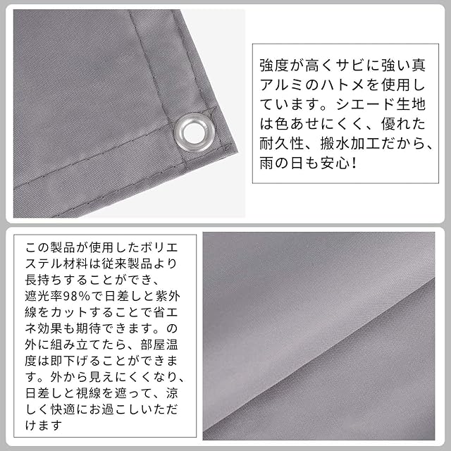 【省エネ効果】シェードを取り付けることで、室内の温度を下げることができ、省エネ、節電に役立ちます。使わない時は収納できます。カビを防ぐぎ、変形や色色褪せしにくい素材を使用しています。様々な色から選ぶことができます。