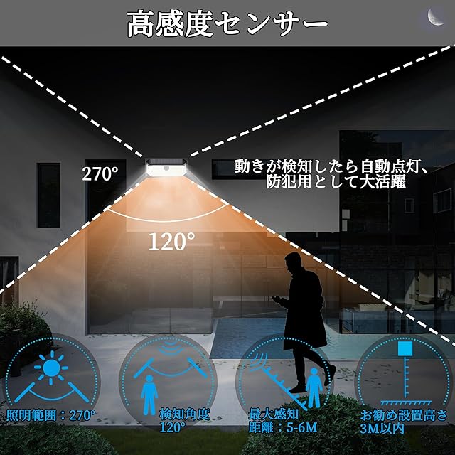 【高感度センサーと自動点灯&消灯】ソーラーセンサーライトはPIRモーションセンサーと120°モーション検知角度を搭載しており、暗い場合/夜で動きを感知して自動に点灯します、 人が離れると、自動に消灯します、毎回のオン・オフ操作の手間はありません。防犯ライトとして、防犯効果も抜群です!また、駐車場や庭や表玄関など電気の消し忘れが多い場所などに設置するのも効果的です。