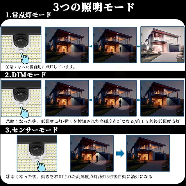 【高度な PIR センサーと3 つのモード】 DijiuGoya の屋外用センサーソーラー ライトは、13 ~ 20 フィート以内、120 度の角度で動きを検知する PIR モーション センサーが搭載されています。このガーデンライトは常時点灯モード、DIMモード、強光センサーモードがありまして、一回目押すると【常時点灯モード】になる:夜または暗くなると自動的に中程度の明るさで点灯します。二回目ボタンを押しすると【DIMモード】になる:夜や暗くなると、自動的に弱光点灯します。 動きを検知すると、15秒間100%の明るさで点灯し、再び暗くなります。三回目ボタンを押しすると【強光センサーモード】になる:夜間に動きを検知すると、100%の明るさで15秒間点灯し続け、その後自動的に消灯します。当社の屋外センサー ライトは、人、動物、車の動きを検知します。通行人が前庭を通過すると、ライトが検知して点灯し、通行人の道を照らし、他の人に便利です。動物や部外者が庭に侵入すると、ライトが警告として点灯し、有効な防犯でき、庭の安全性が向上します。