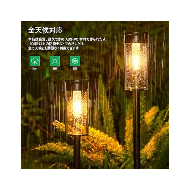 高品質&防水:本ガーデンライトは丈夫なUVフェード耐性ABS樹脂と耐久できのPC材料で作られて、耐熱性、耐衝撃性があり、製品寿命が長い。シェードが30%厚くなり、柱が丈夫で折れにくくなりました。本品にしかない2つの排水口が新たに追加して、大雨などの悪天候による透明ランプシェードの曇りや水の浸入の問題を解決しました。これ以上の水溜まりおよび曇りの悩みはありません。1000回以上の防滴テストで合格したり、IP65防水で、悪い天候でも問題なく利用できます