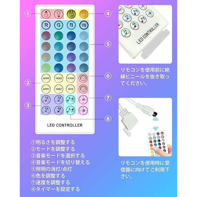 【二重制御方法、タイマー機能】このRGB テープライトはアプリと40キーのリモコンで操作できます。Bluetoothを使用して、AndroidおよびiOS対応のアプリより、テープライトを簡単に操作可能です。電源のON/OFF、明るさ、色、タイマーなどを簡単に設定できます。*本製品は防水ではありません。