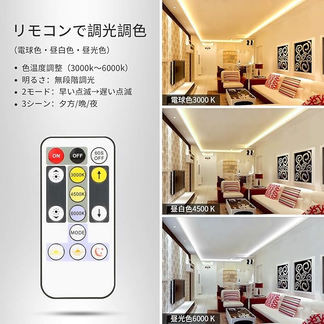 【リモコンで調光調色(電球色・昼白色・昼光色)】幅広く細やかな色温度3000k~6500kまで調整が行えます。完全な白はもちろん、 白よりの電球色や微妙な昼白色、昼光色、温白色も鮮明に実現可能!(ご注意:初使用時、リモコンの絶縁シートを取り外して操作してください。)