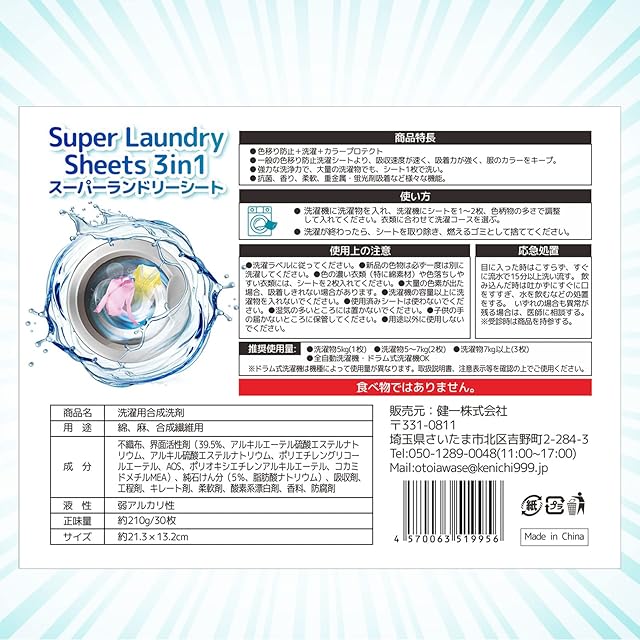 [Kenichi] 洗濯シート 色移り防止シート スーパーランドリーシート3in1 高機能 洗濯洗剤カラープロテクト 強洗浄力 抗菌 香り付きのシート型洗剤 30枚入 (1pc, 3in1)
