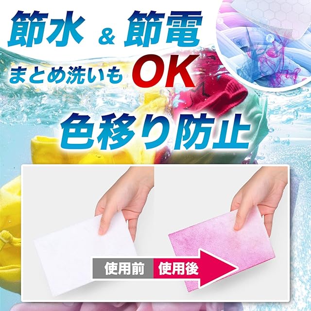 【まとめ洗いも安心】白物や色物をまとめ洗いしても安心です。色物が白くなってしまったり、白物が色移りする心配もありません。異なる色の衣類を一緒に洗っても、色移りを最小限に抑え、衣類を安全に洗うことができます。洗濯回数を減らし、節水や節電効果も期待できます。