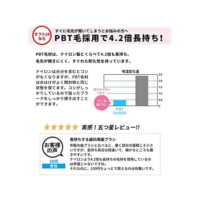 1本1本丁寧に先細毛加工したPBT毛材使用でナイロン製より4.2倍も長持ち!
