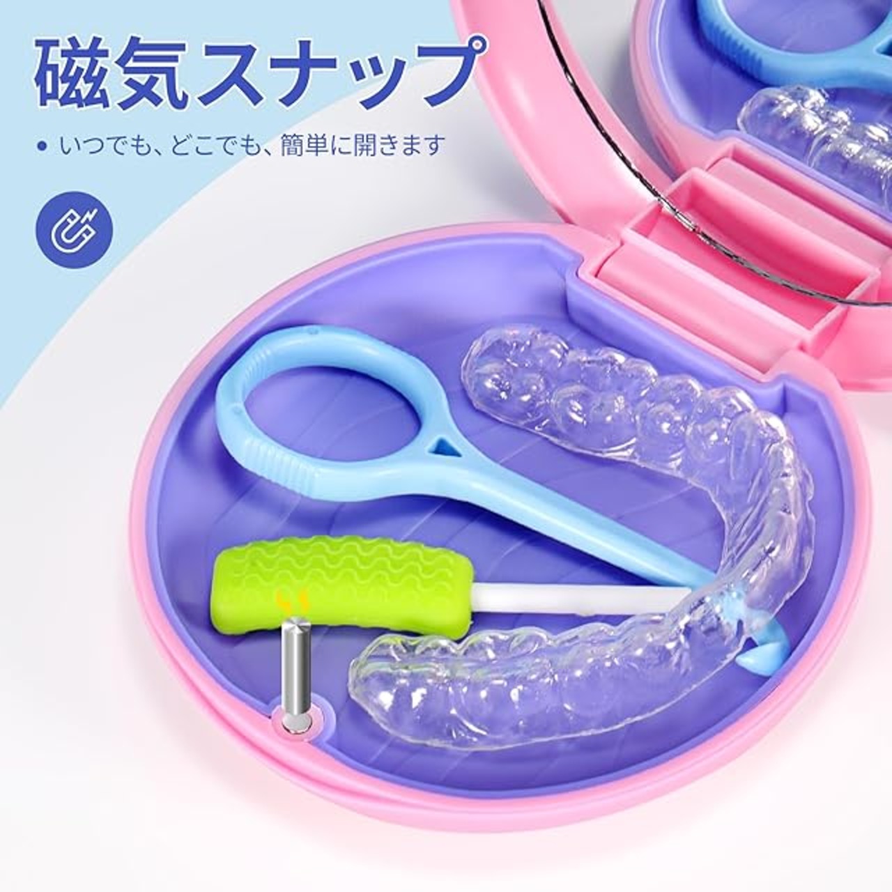 ♥【磁気オンとオフ】歯科用リテーナーホルダーの端には磁石があり、閉じると相互に接続するだけです。 テクスチャード加工されたパッドは、内部の滑りと動きを最小限に抑えるのに役立ちます。 ※たわし又は、みがき粉を使うとキズが付く事があります。