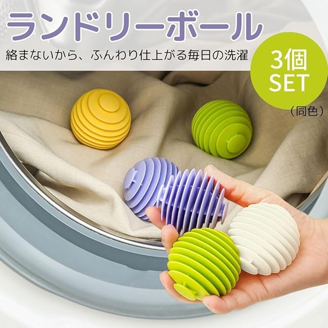 【商品詳細】セット内容:3個 サイズ:直径5.5㎝ 材質:TPR(熱可塑性ゴム) ※ 水量4L~5Lに対し、洗濯ボール3~6個が目安です。洗濯物の素材や数量等でご自由に調整して下さい。 ※乾燥機でご使用いただけますが、設定温度は75度以下でお願いいたします。75度を超える場合、変形や衣類への影響が生じる可能性がございますので、温度をご確認のうえ、十分ご注意くださいませ。