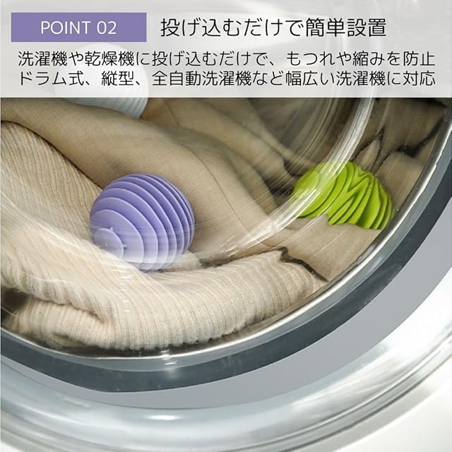 【投げ込むだけで簡単設置!】洗濯機や乾燥機に投げ込むだけで、もつれや縮みを防ぎ、乾燥時間を短縮。糸くずやシワも軽減し、衣類をふんわり滑らかに仕上げます。ドラム式、縦型、全自動洗濯機に対応し、シンプルで可愛いデザインが洗濯時間を楽しく演出します。