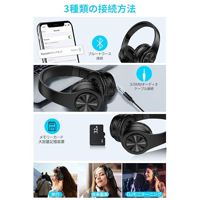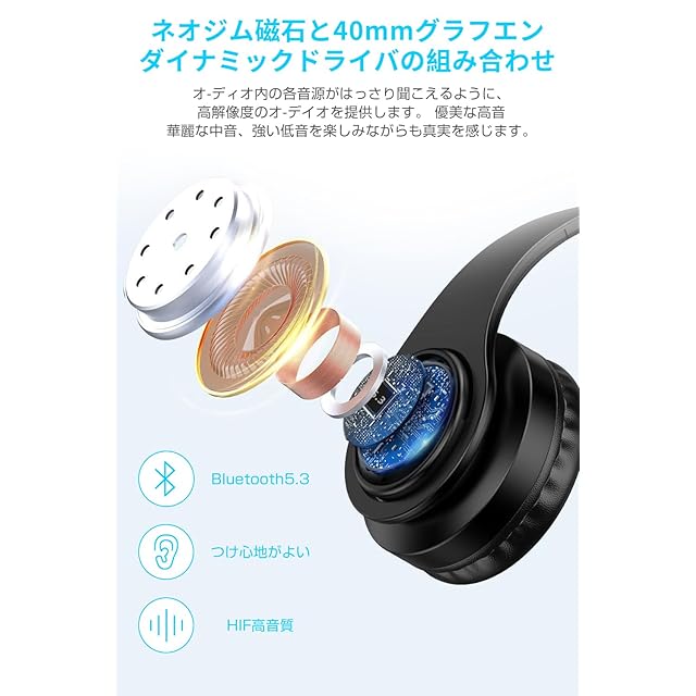 【最先端の Bluetooth5.3/有線 無線両用】Bluetooth ヘッドホンは先進な Bluetooth5.3 技術を採用しています。Bluetooth5.0 と比べて、スピードと安定性が大幅に向上して、接続の遅延、音 飛び、ノイズ、通信の中断、通話の障害などの問題も大幅に改善しました。また、電力の消費が超低いことを実現し ています。ゲーム中の遅延がない、画音の同期をでき、ゲームの快感を楽しみます。ヘッドセットを接続すると、自 動的にペアリングができます。次回の接続は電源を ON にするだけで自動ペアリングできます。3.5mm 端子を搭載し て、付属の AUX ケーブルで高品質の音源を再生できます。いつでもどこでも音楽を楽しみます。「片側に音がない場合は: 音を大きくするか、イヤホンユニットに息を吹きかけて内部ユニットの振動膜をはじき出し、正常な振動に戻すことで音を出すことができます。」