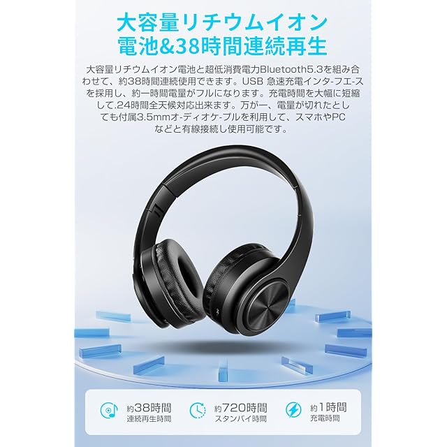 【38時間連続再生/急速充電】ワイヤレスヘッドホンは大容量バッテリと超低消費電Bluetooth5.3を組み合わせて、 本製品は約38時間を連続使用できます。約1時間充電が電力フルです。充電時間を大幅に短縮して、一日の使用に完全に満足して、いつでもどこでも音楽を楽しむことができます。全てのデバイス(iphone/ipad/Android)に接続されている場合、ヘッドセットの電量が表示できます。【パワー 22.5W 以下の AC アダプターを利用して充電してください。】