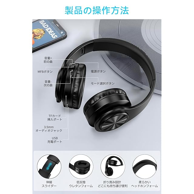 【快適な装着感/折り畳み式】イヤーパッドは高品質の素材を採用しています。本オーバーイヤーヘッドホンは超軽量175gで、耳にフィットして、柔らかくて優れる通気性もあります。装着する時、圧迫感やべたつきなどの不快感はありません。伸縮式のデザインで、バンドの長さを調整でき、さまざまな使用者に完全に適応しています。回転できるハウジングは、耳に合う角度に応じて適合な位置に回転できます。ヘッドセットが軽いので、長時間使用しても疲れません。折り畳み式は、持ち運びが便利です。