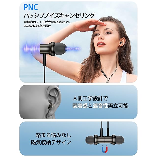 使いやすさは理由がある:磁気収納デザイン 。磁気で一時的にイヤホンを外す場合は、イヤホンを耳から外してくっつき、首に掛けるだけでイヤホンが絡みにくくなり、携帯時にすごく便利です。またはシンプルかつおしゃれな見た目で、被覆は汚れにくく高弾力性シリコンコードを採用、ほこりがつきにくいとからみにくいです.中身は銅線+繊維、断線やカバー破れのこともなく長時間ご利用いただけます. さらに、 3つの異なるサイズのやわらかシリコン素材イヤーキャップと防水収納ケースが付属しています、自分の耳に合ったサイズに選択でき、長く着用しても耳が痛くなりません。イヤホンをちゃんと収納するのはもちろん、SDカード、鍵などの小物も収納できます