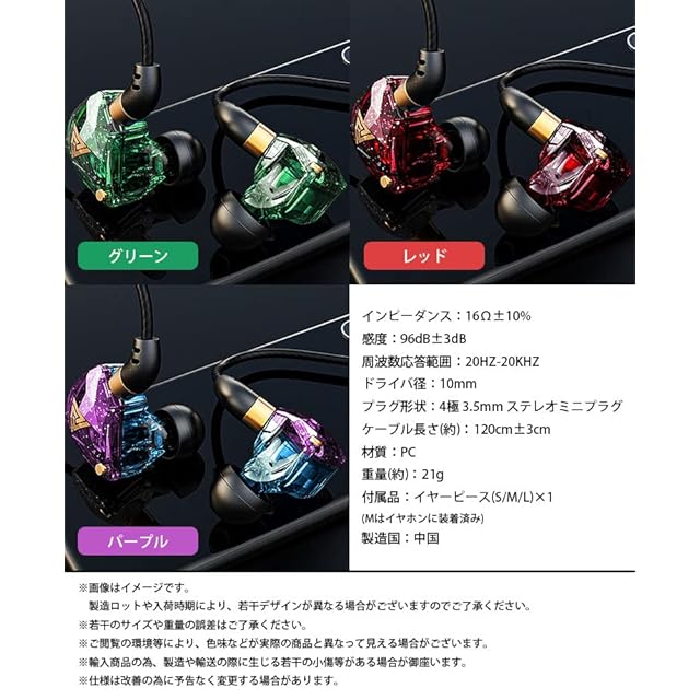インピーダンス:16Ω±10% 感度:96dB±3dB 周波数応答範囲:20HZ-20KHZ ドライバ径:10mm プラグ形状:4極 3.5mm ステレオミニプラグ ケーブル長さ(約):120cm±3cm 材質:PC 重量(約):21g 付属品:イヤーピース(S/M/L)×1(Mはイヤホンに装着済み)