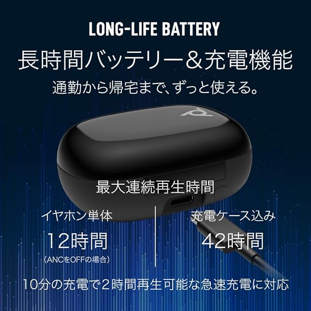 最大連続再生時間 : イヤホン単体 12時間(ANCをOFFの場合)、充電ケース込み 42時間、10分の充電で2時間再生可能な急速充電に対応