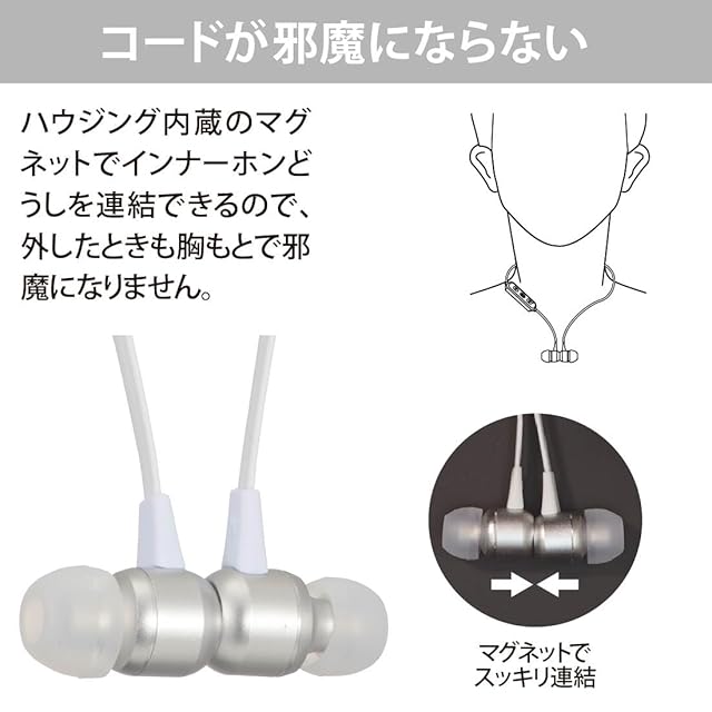 ◆ハウジングはマグネット内蔵、使わないときは左右を連結できるので胸もとスッキリ ◆マイク内蔵のコード一体型コントローラーで通話、再生、音量などを操作できます ◆スマホ2台同時待受ができるマルチポイント対応 ◆充電1時間で連続再生6時間、専用充電コード付属 ◆10gの軽量設計 ◆Bluetooth標準規格 Ver.5.3(正規ライセンス品) ◆汚れが目立ちにくい半透明イヤーチップ(3サイズ)付き ◆本体カラーはシルバー