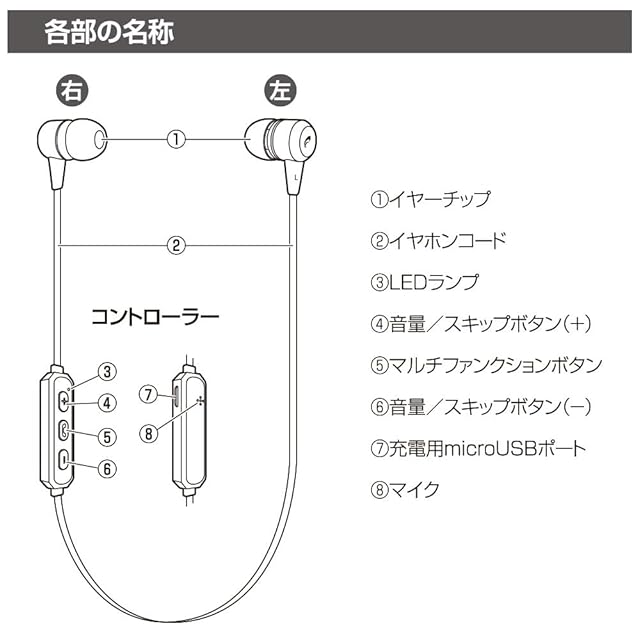 ◆充電時間:約1時間(残量ゼロからフル充電まで) ◆再生可能時間:約6時間(50%音量) ◆通話可能時間:約6時間(50%音量) ◆許容動作温度/湿度:温度…0~40℃/湿度…20~80%(結露なしにて) ◆外形寸法:イヤホン…幅11×高さ11×奥行20mm、コントローラー…幅46×高さ11.9×奥行8.9mm、全長…約58cm ◆質量:約10g ◆付属品:専用充電コード、イヤーチップ(S、M、L)、保証書、取扱説明書