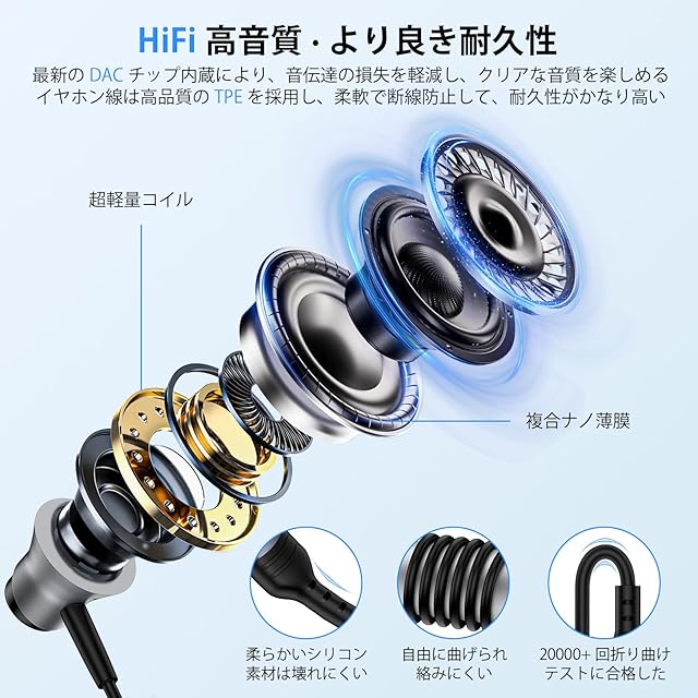 ♫【優れた耐久性&品質保証】有線 イヤホン 高音質きは柔らかい高弾力性TPEを採用し、中身は銅線+繊維、引っ張っても断線しにくく、耐久性がかなり高いです。我々は高品質の製品を提供することに力を入れております。また、1年間の品質保証と30日以内に無条件返品のサービスを提供しておりますので、安心してご購入ください。 製品に関するご質問がある場合は、弊社までお気軽にお問い合わせください。12時間以内にご満足いただけるように回答いたします。