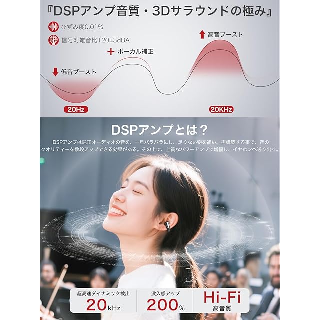 【DSPアンプ機能・AAC/SBCコーデック対応】DSP アンプはサウンドのバランスを最適化し、イヤホン出力の低音域、中音域、高音域のバランスをより良くし、デジタル信号処理を通じてイヤホン内のノイズを効果的に特定して除去します。これにより、音楽の細かなニュアンスや楽器の音色がより鮮明に伝わり、没入感のある音楽体験が得られます。圧縮された音楽ファイルも、元の音源に近い状態で再生します。iPhoneユーザーにはAACコーデック、AndroidユーザーにはSBCコーデックを自動最適化。デバイスを選ばず、常に最高品質の音をお届けします。