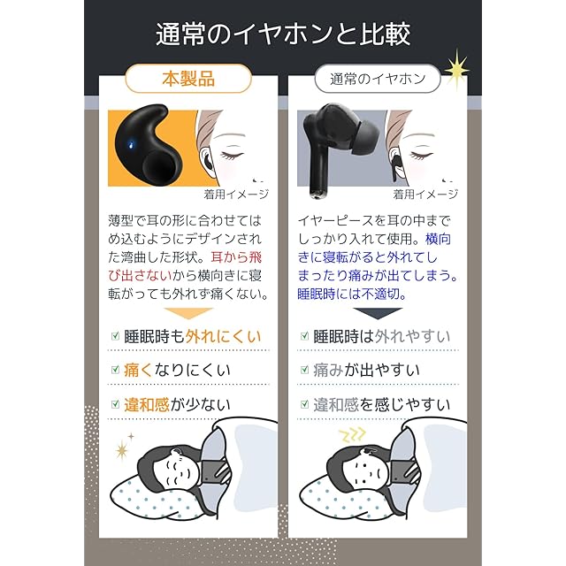 睡眠に快適なデザインで耳からはみ出さない寝ホンです。快適な睡眠のためにデザインされた、特殊な形状のワイヤレスイヤホン。超軽量で負担軽減。耳のくぼみに合わせて装着して耳から飛び出さない超薄型デザイン。 わずか 2.5g の超軽量タイプで痛みや密閉感を防ぎながら横になっても外れにくい。マイク内蔵。通話OKです。