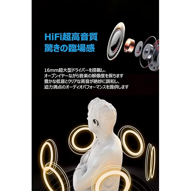 【オープンイヤー設計&クリアな通話】耳を塞がないオープンイヤーのデザインにより、閉塞感が完全に解消し、耳の穴が蒸れむこともなく、まるで耳が呼吸しているような快適な装着感と清潔な感じがします。耳を完全に解放しながら音楽を楽しむことができます。耳穴全体をカバーする特殊設計と指向性のあるサウンド転送技術を搭載され、音の伝送がサウンドホールに集中し、音漏れを最大限抑えることに成功。静かな図書館でも、騒がしいカフェでも、周囲の目を気にすることなく、自分だけの世界に没頭できます。