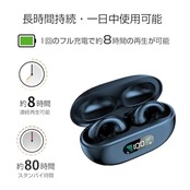 耳を塞がない構造: 一般的なイヤホンのように耳を塞がず、周囲の音も聞こえるため、安全性が高まります。耳に挟むだけで装着するため、閉塞感や圧迫感がありません。 **空気伝導イヤホン**: 骨伝導イヤホンの技術革新版で、空気の振動を利用して音楽を楽しめます。電力消費が低く、耳に優しい設計です。