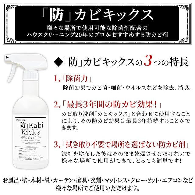 ・お風呂清掃20年のプロがたどり着いた植物由来で出来た防カビ剤です。 ・牡丹等の植物が出す抗菌液を使って微生物を除菌し、防カビ剤でコーティングします。 ・お風呂清掃20年のハウスクリーニングのプロが防カビ剤を一般の方でも使えるように安全性を向上しました。そのため乾燥後は拭き取らずにそのまま快適な生活を送ることができます。 ・ボタニカル(植物由来)の除菌効果でカビ菌・細菌・ウイルスなどを除菌、消臭。カビ取り剤「カビキックス」と合わせて使用することにより、その防カビ効果は最長3年間は持続することができます。 ・単体で使用する:湿気が多くカビが発生する可能性がある箇所は、初めにホコリ等の汚れを取り除き、「防」カビキックスをスプレーして乾燥させます。拭き取り入りません。 ・カビ取り剤と併用する(お勧め):対象のカビを取り除いた後、対象面を完全に乾燥させます。乾燥したら「防」カビキックスをまんべんなくスプレーして乾燥させます。拭き取り入りません。 ・ボタニカルなカビ防止剤 【壁、床、木材、畳、カーテン、家具、衣類、マットレス、クローゼット】などあらゆる箇所に