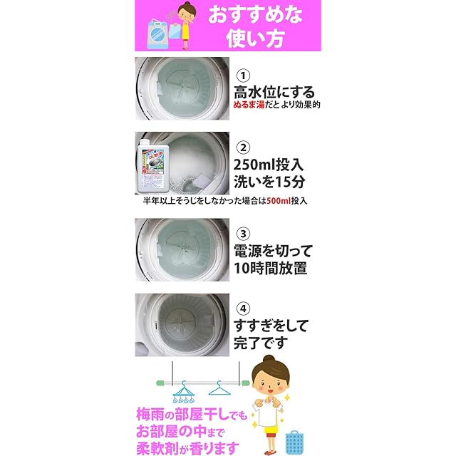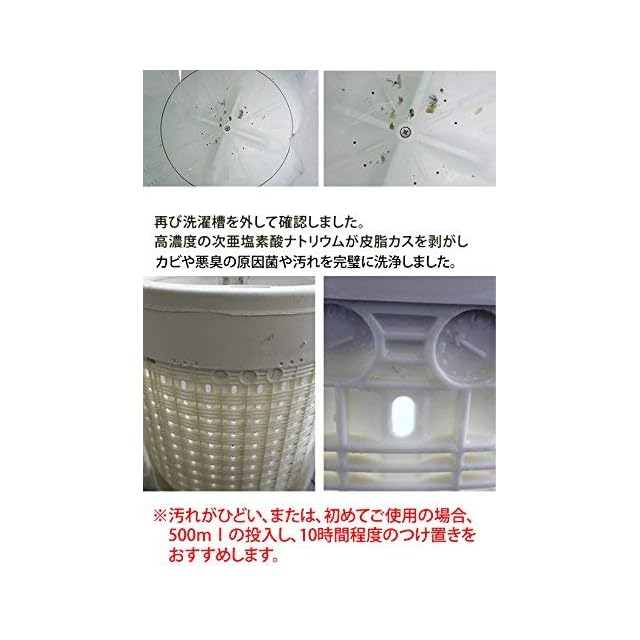 〜使い方〜 ラクラク!洗濯槽に入れてスイッチを押すだけ (1)洗濯槽に水を溜めて(高水位)、洗濯槽クリーナーを250ml投入 *半年以上、洗濯槽クリーナーを使用していなかった場合は500ml投入 (2)5分程度洗いをして電源を切り6-10時間程度放置 (3)すすぎと脱水をする