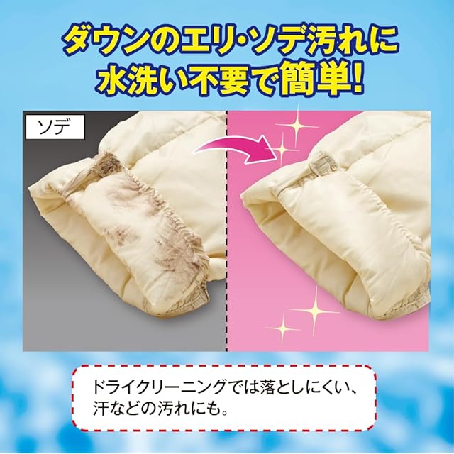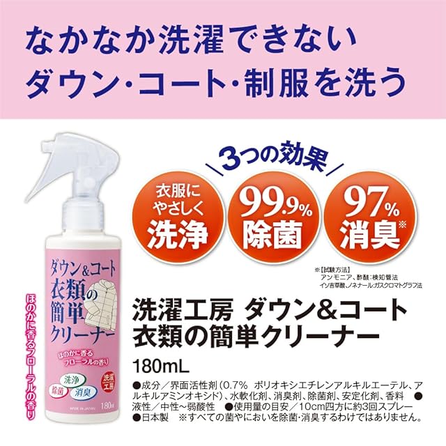 スプレーして拭き取るだけで簡単!ダウン・コートの汚れ、ニオイを落とす。洗浄、除菌、消臭の3つの効果!エリ、ソデ汚れに水洗い不要で簡単! 〇汗ジミ、皮脂による黒ずみに ドライクリーニングでは落としにくい、汗などの汚れにも。 〇なかなか洗濯できないダウン・コート・制服を洗う ダウン・コート・制服などの、クリーニング代を節約! 【3つの効果】 〇衣類にやさしく洗浄 〇99.9%除菌 〇97%消臭※ ※【試験方法】アンモニア、酢酸:検知管法 イソ吉草酸、ノネナール:ガスクロマトグラフ法 ほのかに香るフローラルの香り ※すべての菌やにおいを除菌・消臭するわけではありません。