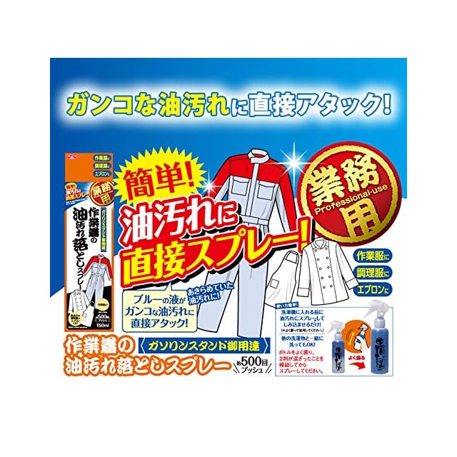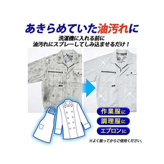 ガンコな油汚れに直接アタック!ガソリンスタンド御用達!作業着の油汚れ落としスプレー。洗濯機に入れる前の油で汚れた衣類にスプレーしてしみ込ませるだけ!他の洗濯物と一緒に洗ってもOKです。作業着、飲食店の調理服やエプロンにも!よく振って2剤が混ざった状態でお使いください。
