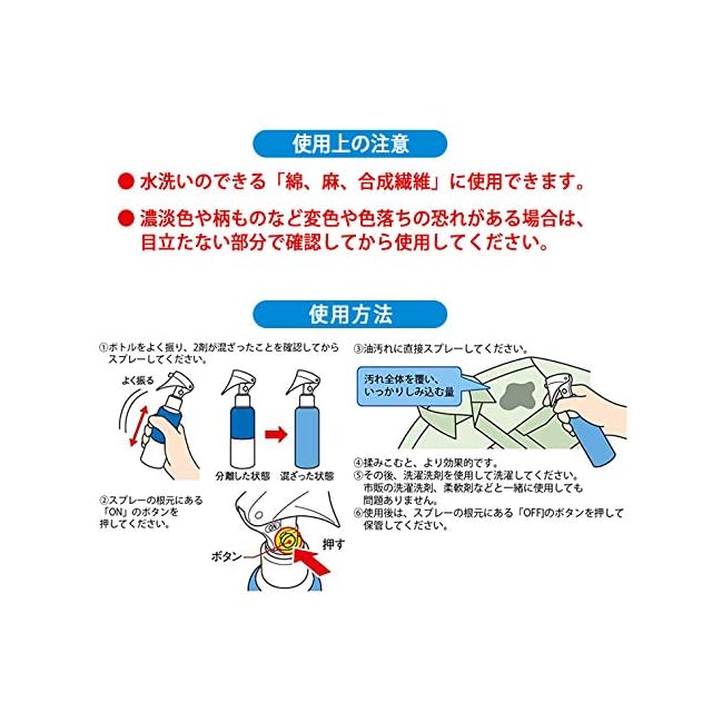 【商品仕様】正味量/150ml(約500回プッシュ)、成分/界面活性剤(30% ポリオキシエチレンアルキルエーテル)、分散剤(クエン酸塩)、溶剤、香料、染料、使用量の目安/汚れ全体を覆い、しっかりしみ込む量、用途/綿、麻、合成繊維用※毛、絹、水洗いのできない衣類には使用できません、原産国/日本