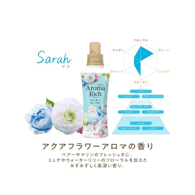 香り:アクアフラワーアロマの香り。ペアーやマリンのフレッシュさに、ミュゲやウォーターリリーのホワイトフローラルを加えた、みずみずしい奥深い香り