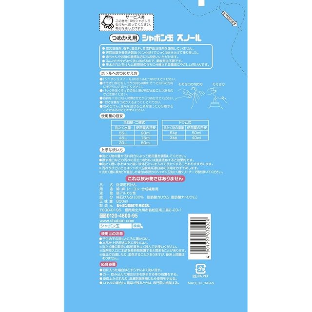 シャボン玉スノール液体タイプのつめかえ用です。 蛍光増白剤・香料・着色料・酸化防止剤・LASなどの合成界面活性剤を使用していない無添加の液体洗濯石けんです。大人の方の衣類はもちろん、ベビー服から敏感肌の方の衣類まで、幅広くご使用いただけます。 天然油脂を釜炊き製法(ケン化法)で熟練の石けん職人がじっくり炊き上げた石けんです。 ふんわりやわらかく洗い上がるので、柔軟剤は不要。全自動洗濯機、ドラム式洗濯機どちらでもご使用いただけます。 排水された石けんは短期間のうちに分解される、環境にやさしい無添加石けんです。