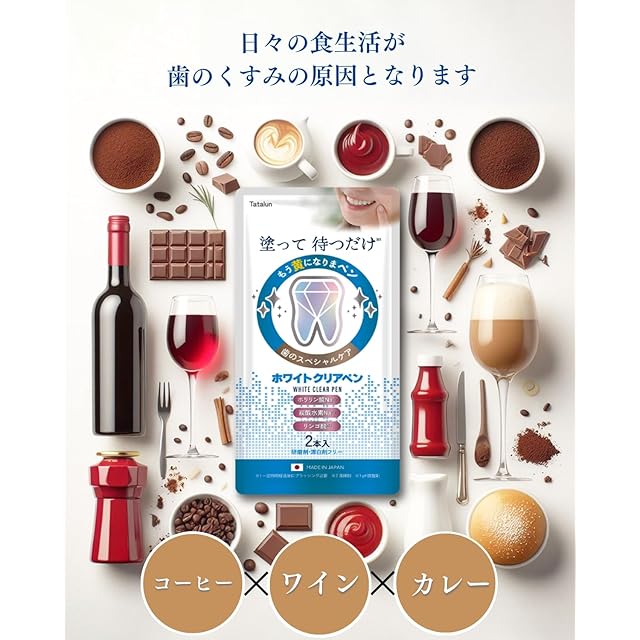 【自宅で ホワイトニング (※1)】コーヒー、ワイン、紅茶、カレーなど色の濃い食べもの気になりませんか?自宅で ホワイトニング ケア(※1)。(※1)ブラッシング効果による。