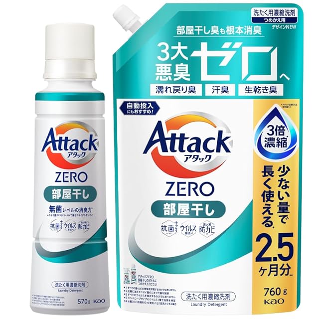 アタック 【まとめ買い】ZERO 液体史上 最高の清潔力。無菌レベルの消臭力 部屋干し 大サイズ 本体 570g+詰替え760g