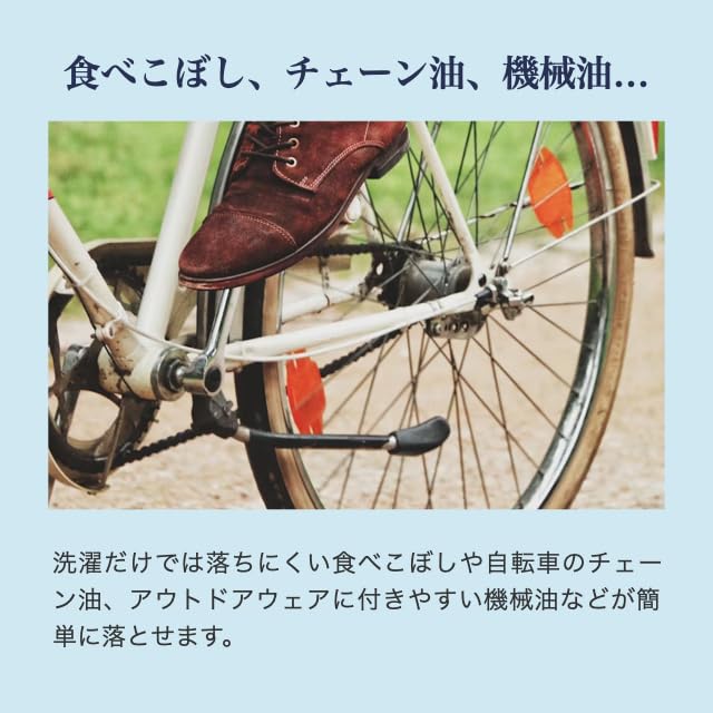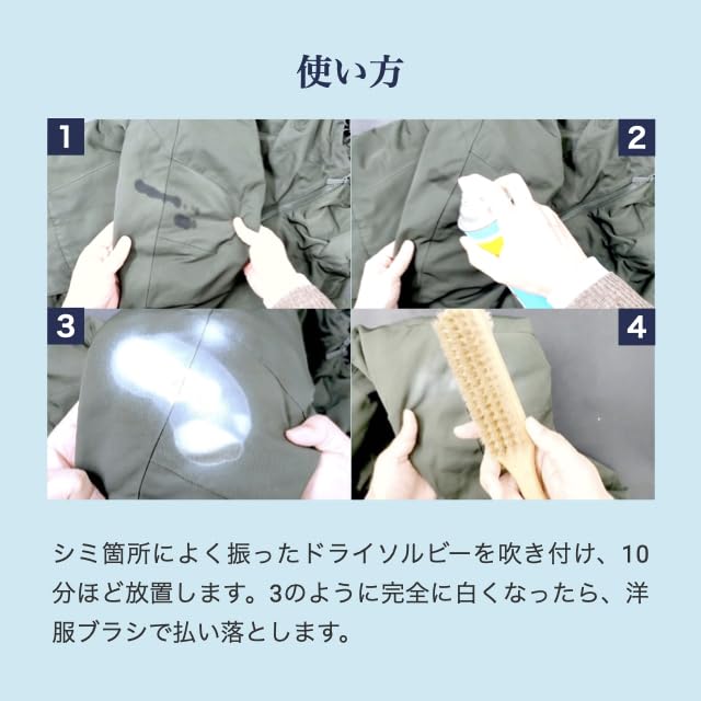 混合溶剤の汚れに対する優れた溶解性と、10ミリミクロンの超微粒子パウダーによる吸着性の相乗効果で、 特に油脂系のシミ汚れや、輪ジミを強力に除去します。 裏地の付いた製品や輪ジミ消し、シミ抜きの仕上げなど利用範囲の広さが特徴です。 スプレーして数分で乾燥してパウダーが浮き上がりますので、ブラシなどで払い落としてください。